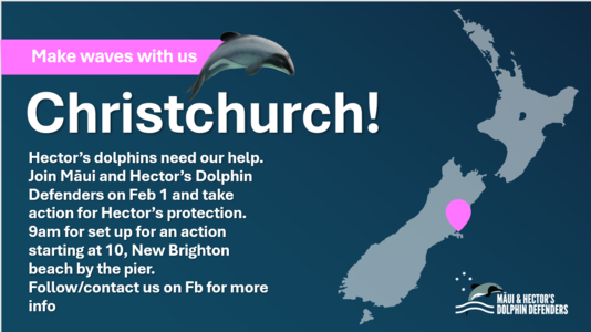Join us for an action in memory of the at least 17 Hector's dolphins killed across New Zealand, most of them on the East Coast around Canterbury, since October 2023.